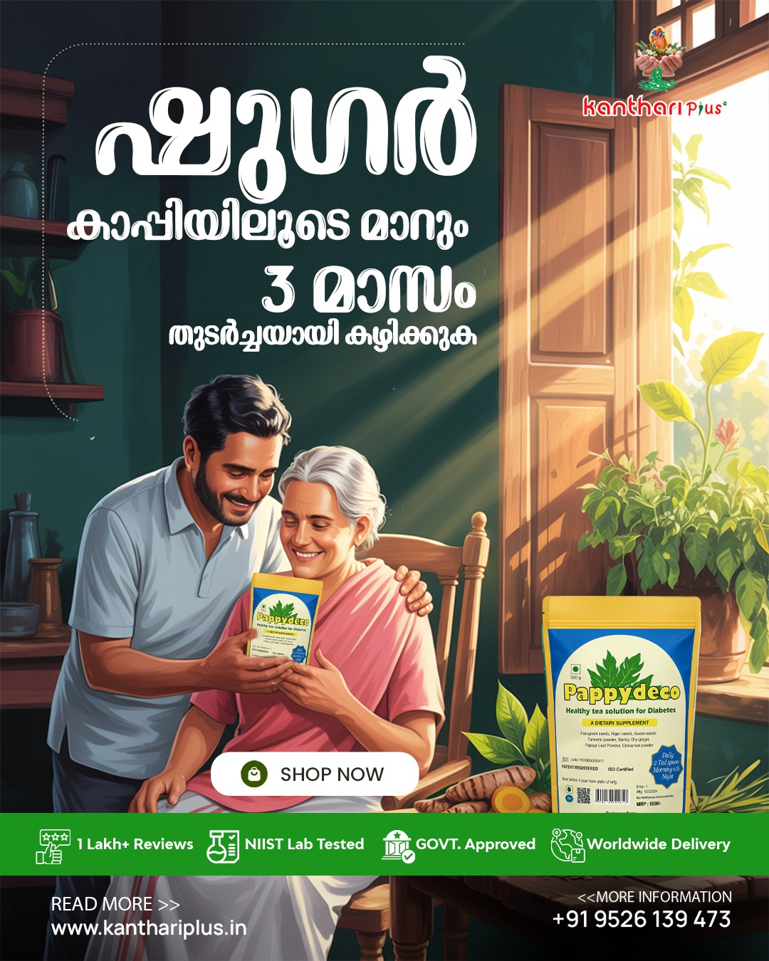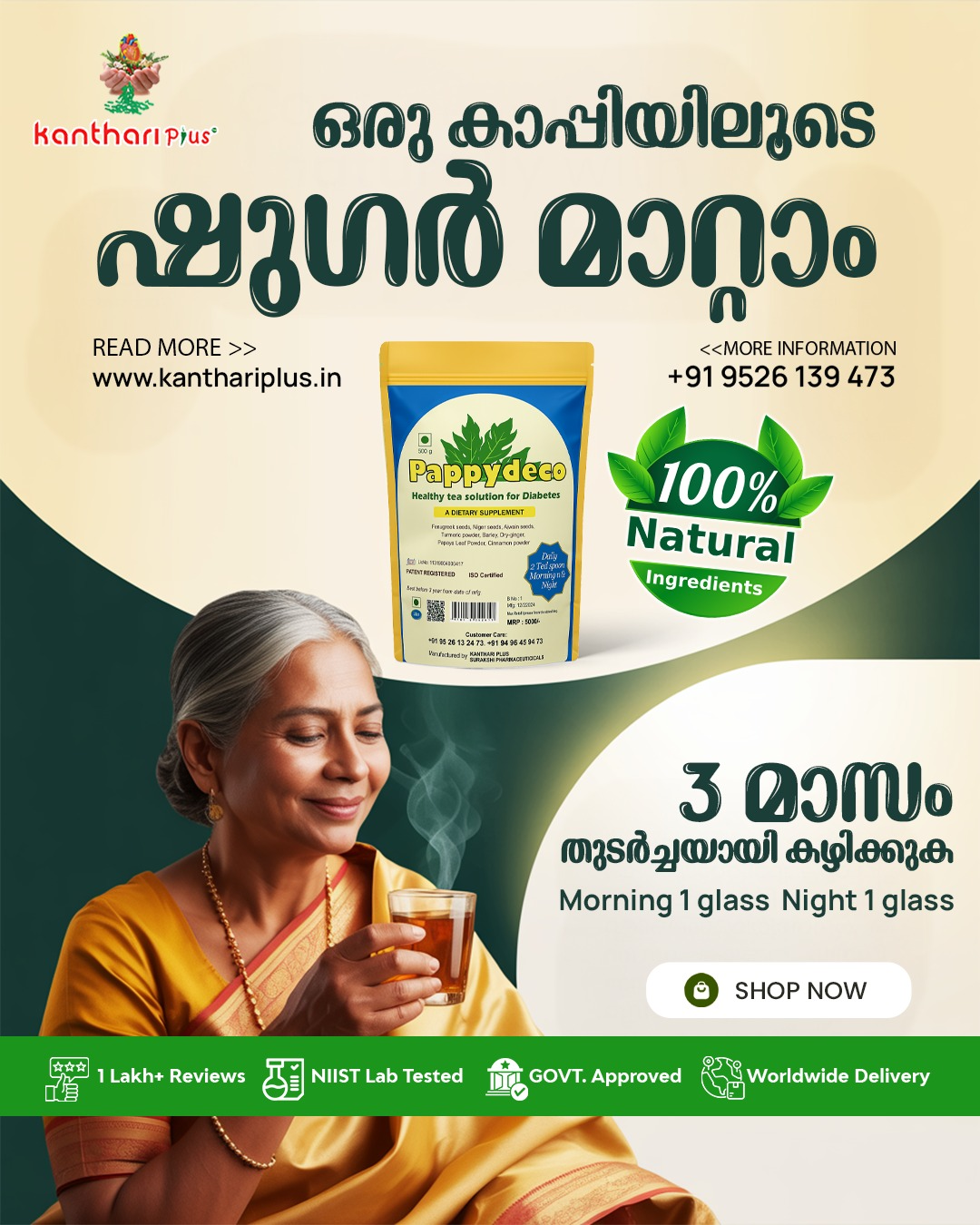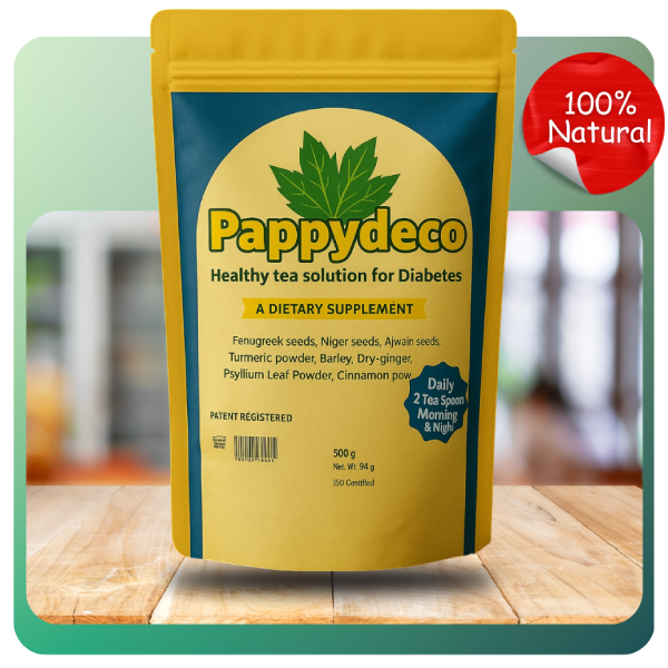 Manage your blood sugar levels naturally with Pappydeco, a healthy tea solution from Kanthari Plus. Formulated with 100% natural ingredients, this daily health drink is designed to support your wellness journey. ✅ 100% Natural Ingredients: Pure and safe for daily consumption. ✅ Lab Tested & Approved: Certified by NIIST and Government approved for quality you…